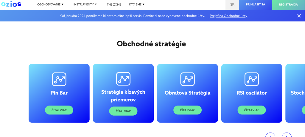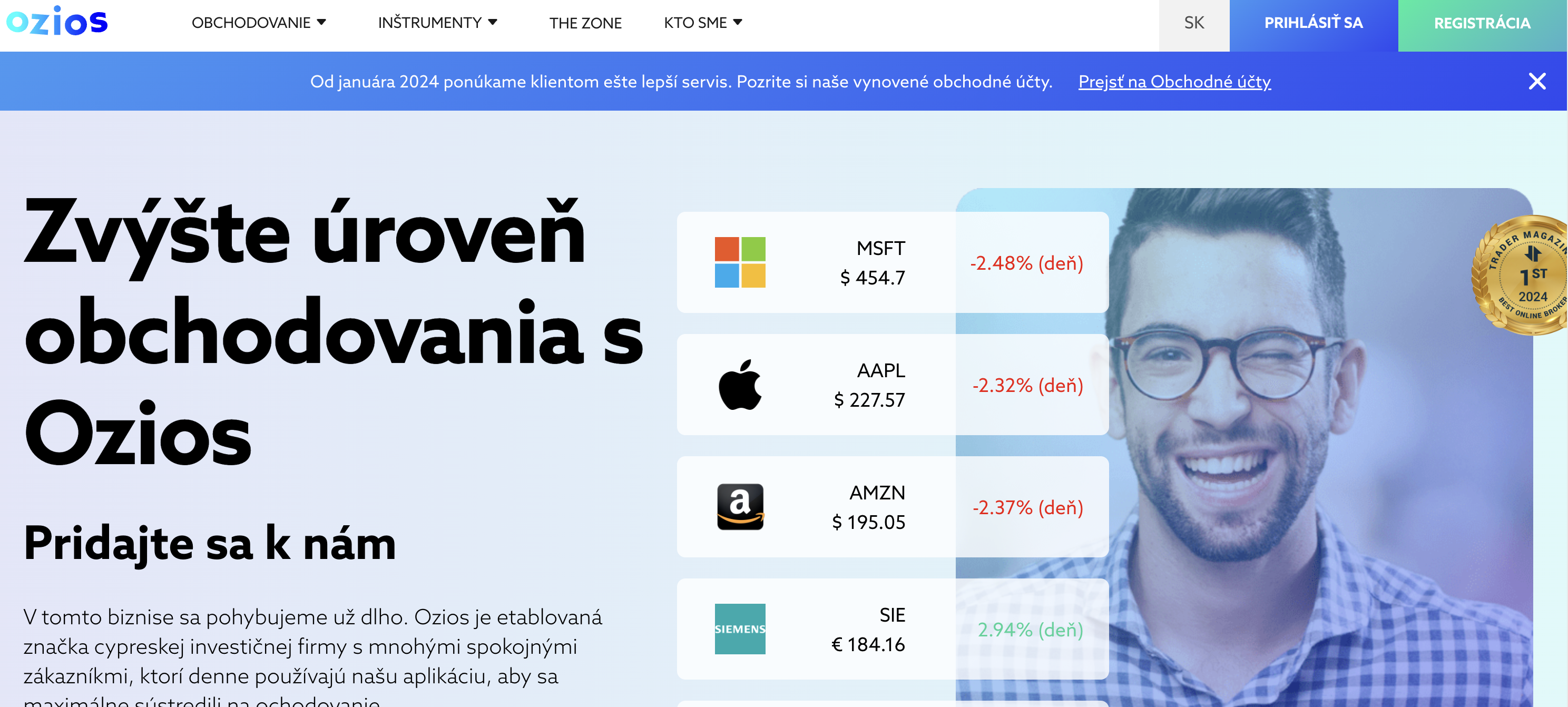 První dojem z domovské stránky Ozios je příjemný. Jsou na ní všechny informace potřebné k seznámení s funkcemi webu. Vzdělávací a efektivní prezentace informací je velmi přitažlivá. Základní lokalizace stránek je v angličtině, navíc jsou stránky přeloženy do slovenštiny a řečtiny. Slabší jazykové možnosti stránek ve srovnání s jinými brokery lze považovat za nevýhodu, ale pro slovenského obchodníka to nepředstavuje zvláštní problém. Znalost anglického jazyka není pro obchodování nutná.